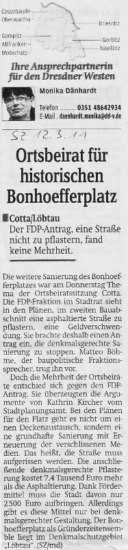 Beim Bonhoefferplatz West war dieser Kompromiss offenbar nicht möglich. Aber, als “Trostpflaster” soll dafür die Poststraße und die Waldheimerstraße asphaltiert werden. Deren Realisierung ist in naher Zukunft allerdings unwahrscheinlich.