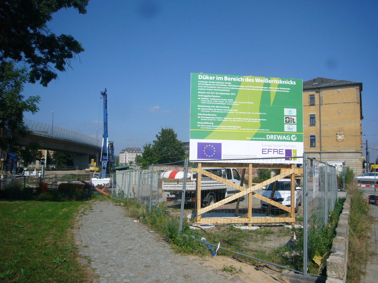 Neben der Fernwärme werden laut Bauschild auch Mittelspannungskabel und Fernwärmeleitungen unter die Weißeritz gelegt. Die alte Brücke wird abgerissen und schließlich der Grünzug anschließend angebunden. Fertigstellung ist erst im September 2012. Vermutlich möchte man die Umschaltung der Fernwärme im nächsten Sommer vornehmen. Eine Unterbrechung im Winter wird auf wenig Gegenliebe stoßen.