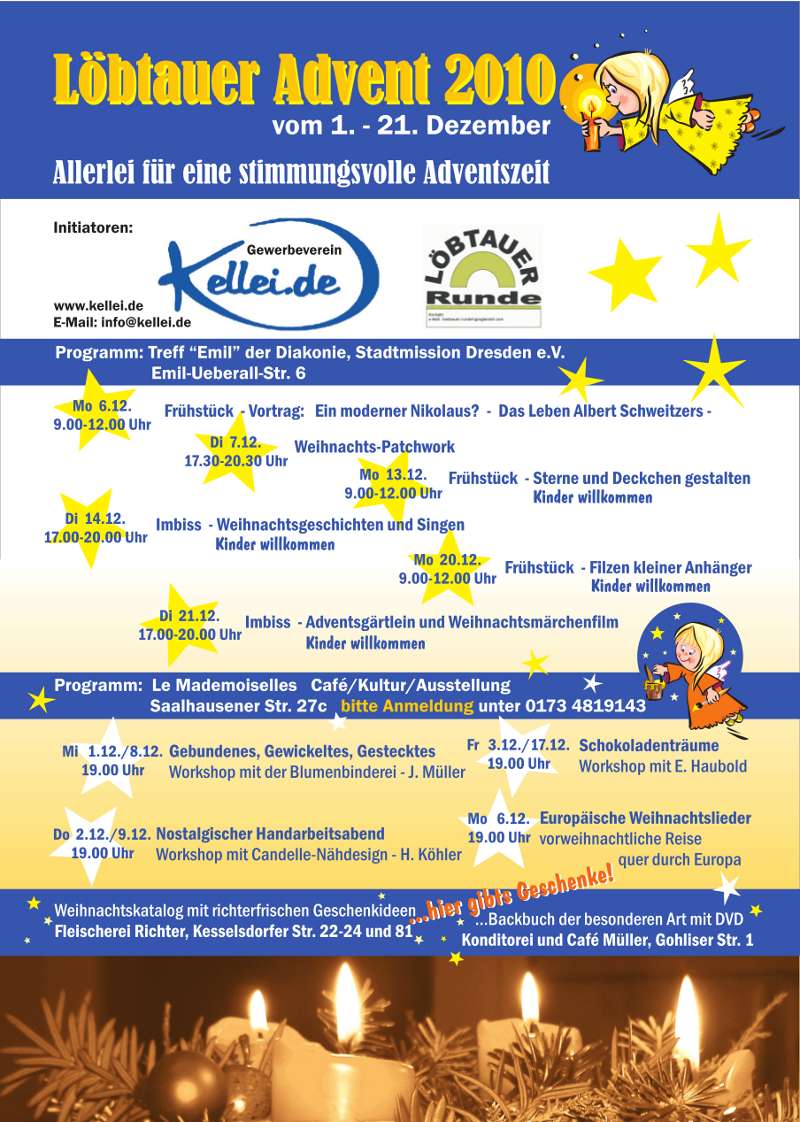 Am 1. Dezember 2010 startet wieder der Löbtauer Advent. Eine Initiative des Gewerbevereins Kesselsdorfer Straße und der Löbtauer Runde unter Mitwirkung von Geschäften, Vereinen und Bürgerbüros in Löbtau.